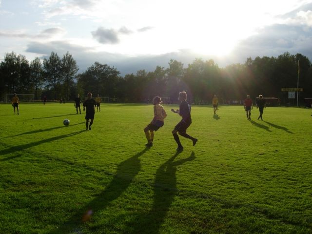 Räppe B tog ännu en storseger i Utv. B Södra, denna gång var det Furuby IF som fick känna på Räppes stål. Egentligen kan jag i princip kopiera matchreferatet ifrån förra matchen mot T/V. Räppe dominerade nämligen denna tillställning från start till mål och trots 6 st gjorda mål så var det oskärpa i avsluten. (ifrån i princip samtliga denna soliga måndagskväll.) Börjesson i målet behövde mest oroa sig för några hemåtpass annars så stod han mest och gottade sig i den varma solen. I övrigt hände inte mycket som är värt att skriva hem till mamma om men målen gjordes i alla fall på följande sätt: Första halvlek: 1-0, Martin Svensson. Staffan Johansson spelar bollen snett bakåt till Martin som placerar bollen invid stolproten. 2-0, Sebastian Winberg. En lång boll av Andreas Finnström ger Sebbe fritt läge ifrån mittplan, sebb utnyttjar sin snabbhet och springer i princip in i mål med bollen. 3-0, Magnus Svensson. Säker straff efter att Emil Johansson blivit fälld. 4-0, Staffan Johansson. Alexander Gullberg avlossar bössan utanför straffområdet och på returen rakar Staffan in bollen. Andra halvlek: 5-0, Magnus Svensson. Misslyckad hörna från Eric Rosander gör att han återfår bollen och på sitt andra försök når Magnus först och nickar in bollen. 6-0, Fredrik Kristensen. Lite kalabalik inne i straffområdet efter en hörna, och efter bollen studsat omkring lite dunkar Fredrik upp bollen i nättaket. Sammanfattningsvis kan man säga att Räppe var minst tre storlekar för stora för Furuby. Hela matchen gick i ett sömnigt tempo och, som sagt, med lite mer skärpa kunde det blivit tvåsiffrigt -------------------- Sista matchen för vårsäsongen är nu avklarade och det är nu uppehåll fram till 27/7 då träningen drar igång igen. Under dokument(till vänster i menyn) finns ett träningsprogram att följa under uppehållet. Om andan(och tiden) faller på kanske det framåt veckan kommer en liten sammanfattning av Räppes framgångsrika vårsäsong.